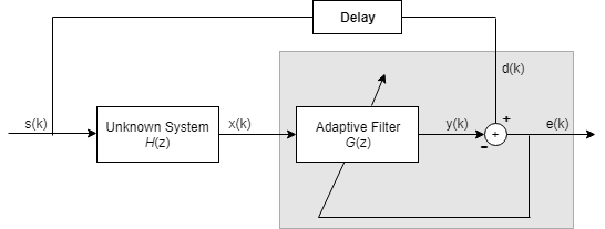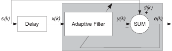 Принимая эти допущения, адаптивный фильтр должен предсказать будущие значения требуемого сигнала на основе прошлых значений. Когда s (k) является периодическим и фильтр достаточно длинный для запоминания предыдущих значений, эта структура с задержкой во входном сигнале может выполнять предсказание. Эту структуру можно использовать для удаления периодического сигнала из стохастических шумовых сигналов.