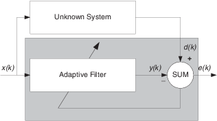 На рисунке неизвестная система размещена параллельно адаптивному фильтру. Этот макет представляет собой только одну из многих возможных структур. Затененная область содержит адаптивную систему фильтров.