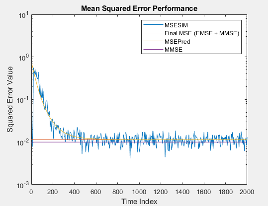 Минимизация среднего квадрата сигнала ошибки между выходом адаптивного фильтра и требуемым сигналом является наиболее распространенным критерием оптимизации для адаптивных фильтров. Фактический MSE (MSESIM) реализуемого адаптивного фильтра может быть определен с помощью msesim функция. Ожидается, что траектория этого MSE будет следовать траектории прогнозируемого MSE (MSEPred), которая вычисляется с использованием msepred функция. Минимальная среднеквадратическая ошибка (MMSE) оценивается по msepred с помощью фильтра Винера. Фильтр Вайнера минимизирует среднеквадратичную ошибку между требуемым сигналом и входным сигналом, отфильтрованным фильтром Винера. Большое значение среднеквадратичной ошибки указывает на то, что адаптивный фильтр не может точно отслеживать требуемый сигнал. Минимальное значение среднеквадратичной ошибки гарантирует оптимальность адаптивного фильтра. Избыточная среднеквадратическая ошибка (EMSE), определяемая msepred функция - это разность между MSE, введенным адаптивными фильтрами, и MMSE, произведенным соответствующим фильтром Винера. Конечный MSE, показанный ниже, является суммой EMSE и MMSE и равен прогнозируемому MSE после сходимости.