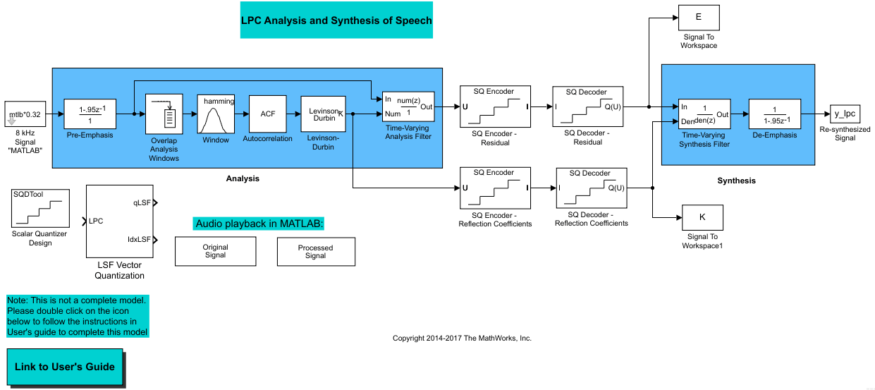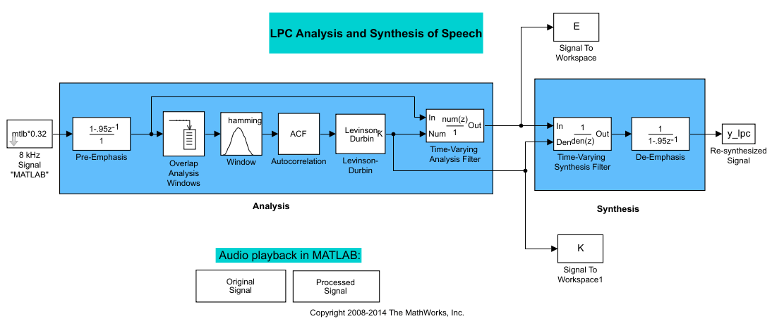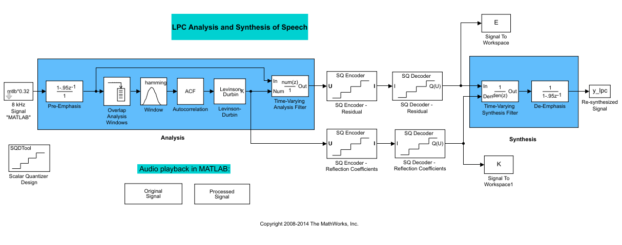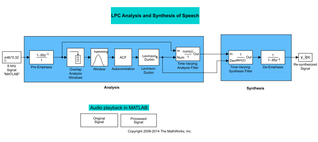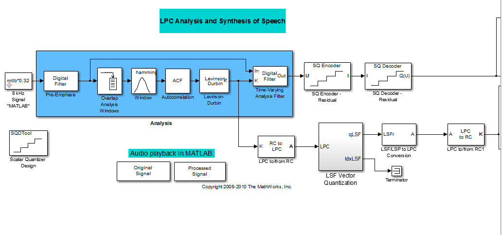 Эта модель предварительно подчеркивает входной речевой сигнал, применяя фильтр FIR. Затем вычисляет коэффициенты отражения каждого кадра с помощью алгоритма Левинсона-Дурбина. Модель использует эти коэффициенты отражения для создания фильтра анализа линейного прогнозирования (решетчатая структура). Затем модель вычисляет остаточный сигнал путем фильтрации каждого кадра предварительно подчеркнутых речевых выборок с использованием коэффициентов отражения. Остаточный сигнал, являющийся выходом каскада анализа, обычно имеет меньшую энергию, чем входной сигнал. Блоки на стадии синтеза модели фильтруют остаточный сигнал с использованием коэффициентов отражения и применяют всеполюсный фильтр снятия акцента. Фильтр снятия ударения является обратным фильтру предварительного ударения. Результатом является полное восстановление исходного сигнала.