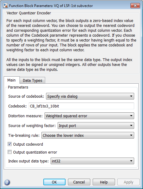 Откроется диалоговое окно Параметры блока: VQ (Block Parameters: VQ of LSF: 1st subvector).