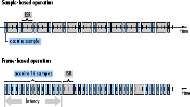 На следующем рисунке показано, как обработка на основе кадров увеличивает пропускную способность. Каждый из тонких блоков представляет время, прошедшее во время получения образца. Каждый более толстый блок представляет время, прошедшее во время процедуры обслуживания прерываний (ISR), которая считывает данные из аппаратных средств.