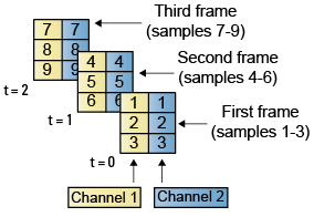 При обработке на основе кадров блокирует обработку данных по одному кадру за раз. Каждый кадр данных содержит последовательные выборки из независимого канала. Каждый канал представлен столбцом входного сигнала. Например, с точки зрения обработки на основе кадра следующая матрица 3 на 2 имеет два канала, каждый из которых содержит три выборки.