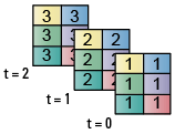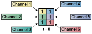 При настройке блока для выполнения обработки на основе выборки блок интерпретирует скалярный вход как одноканальный сигнал. Аналогично, блок интерпретирует матрицу M-на-N как многоканальный сигнал с M * N независимыми каналами. Например, при обработке на основе выборок блоки интерпретируют следующую последовательность матриц 3 на 2 как шестиканальный сигнал.