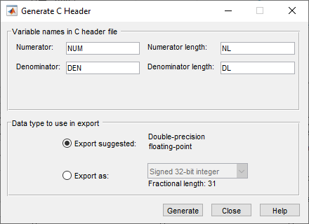 Можно также отправить фильтр в файл заголовка C или создать код MATLAB для создания фильтра из командной строки. Подробные инструкции см. в следующих разделах: