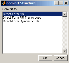 Прямая форма FIR Прямая форма FIR транспонирована | Числитель, Длина числителя * и Количество секций (неактивно, если фильтр имеет только одну секцию) |