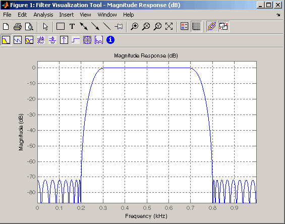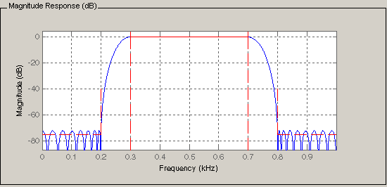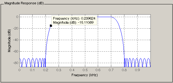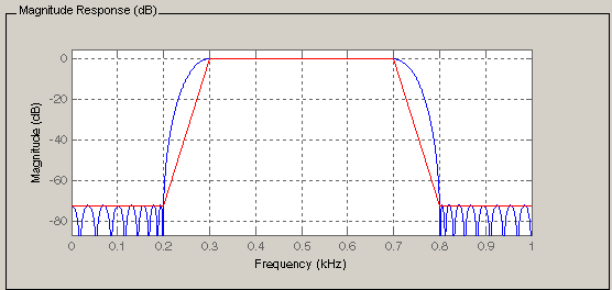 Можно также просмотреть спецификации фильтра на графике Величина (Magnitude) разработанного фильтра, выбрав Вид (View) > Маска спецификации (Specification Mask).