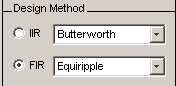 Чтобы выбрать алгоритм Remez для вычисления коэффициентов фильтра FIR, установите переключатель FIR и выберите Equiripple из списка методов.