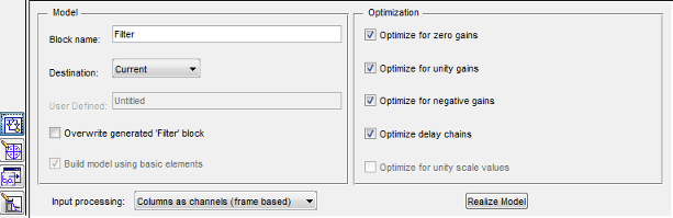 Если установлен флажок Построить модель с использованием базовых элементов (Build model using basic elements), фильтр создается как блок подсистемы (Simulink), в котором используются отдельные подэлементы. В этом режиме доступны следующие оптимизации: