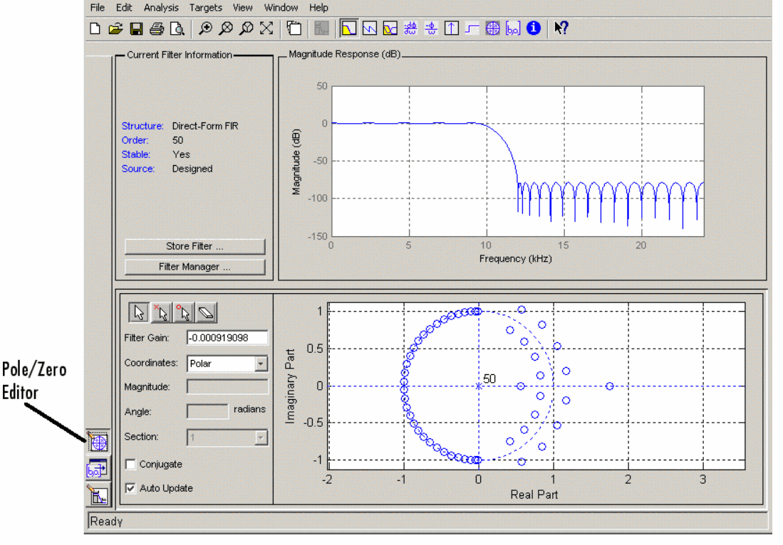 Можно также просмотреть коэффициенты фильтра и подробную информацию о фильтре в этой области.
