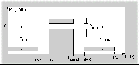 Для полосового фильтра можно задать следующие характеристики амплитудной характеристики: