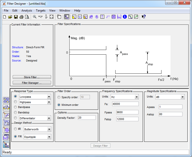 Обратите внимание, что при открытии конструктора фильтров функция «Фильтр проекта» не включена. Чтобы включить фильтр конструкции, необходимо изменить конструкцию фильтра по умолчанию. Это справедливо для каждого изменения конструкции фильтра. Изменения в элементах переключателя или в элементах раскрывающегося меню, например, в разделе Тип ответа или Порядок фильтра немедленно включите фильтр конструкции. Изменения спецификаций в текстовых полях, таких как Fs, Fpass и Fstop, требуют щелчка за пределами текстового поля для включения фильтра конструкции.