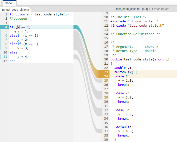 Чтобы просмотреть код MATLAB и код C рядом друг с другом, щелкните Код трассировки (Trace Code).