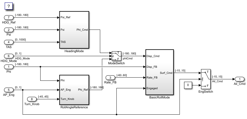 Модель представляет собой один компонент в большой системе управления летательного аппарата. Через HDG_Mode по сигналу система управления переводит модель в один из двух режимов работы: удержание положения крена или удержание курса. RollAngleReference и HeadingMode подсистемы вычисляют уставку положения крена, которая поддерживает один из режимов работы. Затем, BasicRollMode подсистема, контроллер PID, вычисляет команду положения элерона на основе уставки и обратной связи, которая указывает измеренное положение крена и скорость изменения. Модель рассчитана на работу на частоте 40 Гц.