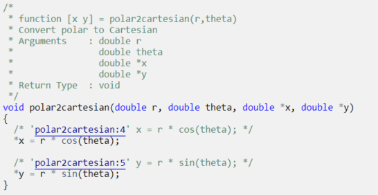 codegen -config cfg -report polar2cartesian -args {0, 0}