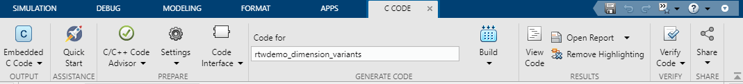 При работе с иерархией моделей откройте приложение Embedded Coder в окне Simulink Editor для верхней модели иерархии, для которой создается код. На вкладке Код C функциональные возможности применяются к верхней модели иерархии, открытой в редакторе.