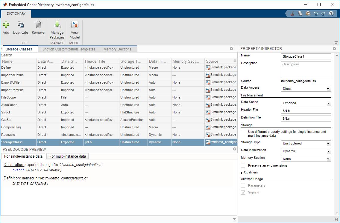 В окне Embedded Coder Dictionary на вкладке Storage Classes в таблице показаны классы хранения, определенные в ECoderDemos пакет. Теперь, в rtwdemo_rollэти классы хранения можно выбрать в редакторе сопоставлений кодов на вкладке «Значения по умолчанию».
