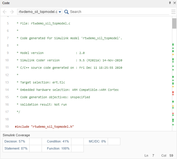 rtwdemo_sil_topmodel в режиме SIL. Поскольку включены элементы управления Coverage Collection и Profile Code, моделирование SIL также выполняет анализ покрытия кода и профилирование выполнения кода. Для покрытия кода требуется Simulink Coverage™.