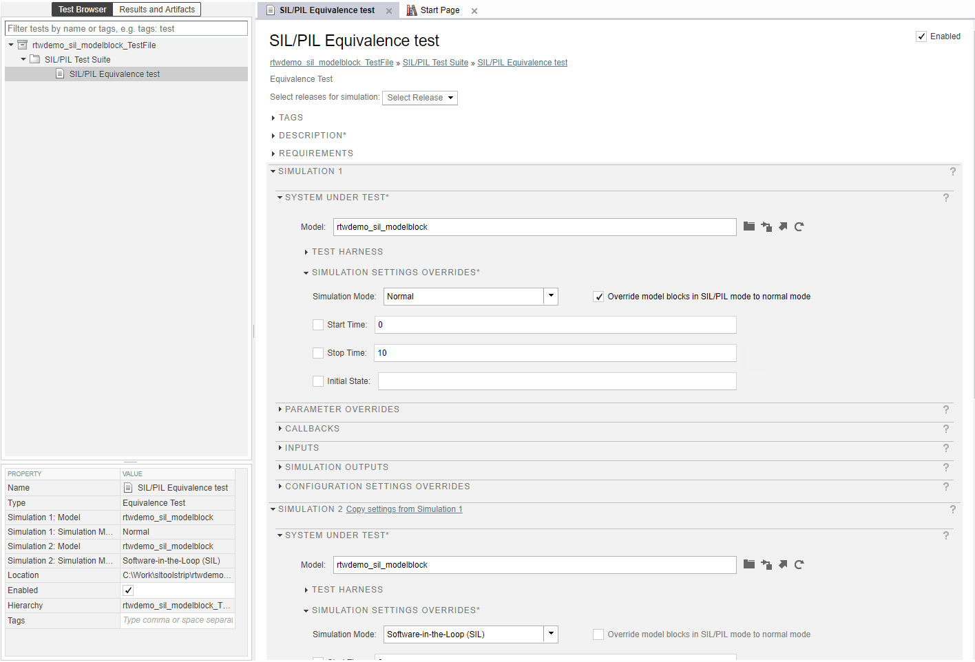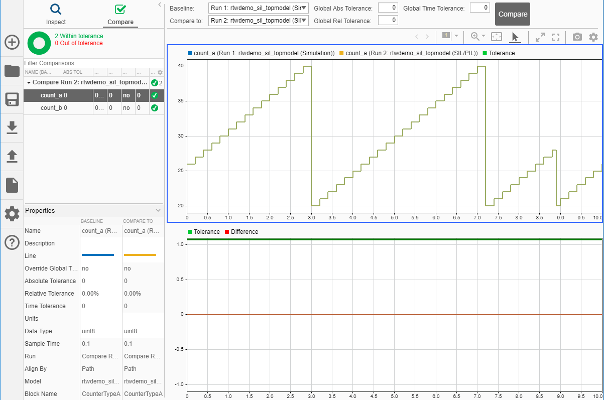 Одним щелчком проверьте числовую эквивалентность между моделью и сгенерированным кодом, выполнив моделирование модели «назад-назад» и моделирование программного обеспечения в цикле (SIL) или процессора в цикле (PIL).