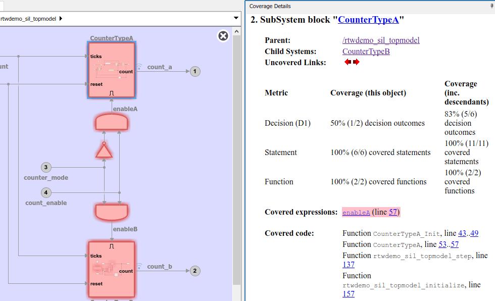 В редакторе Simulink отображается вкладка Coverage. Чтобы отобразить результаты анализа покрытия кода, в разделе «Обзор результатов» щелкните Сведения о покрытии. Чтобы просмотреть метрики покрытия для определенного блока, в представлении модели щелкните блок, который окрашен в красный цвет.