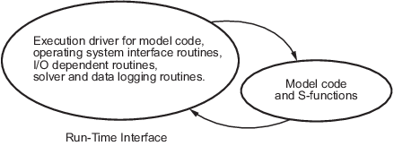 Генератор кода также предоставляет интерфейс, который выполняет сгенерированный код модели. Интерфейс и код модели компилируются вместе для создания исполняемой программы. На следующем рисунке показан объектно-ориентированный вид исполняемого файла высокого уровня.