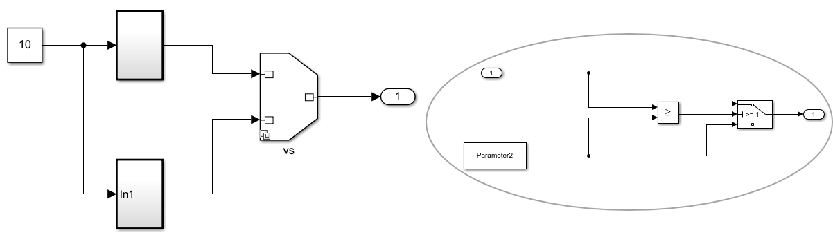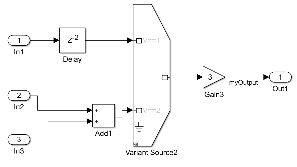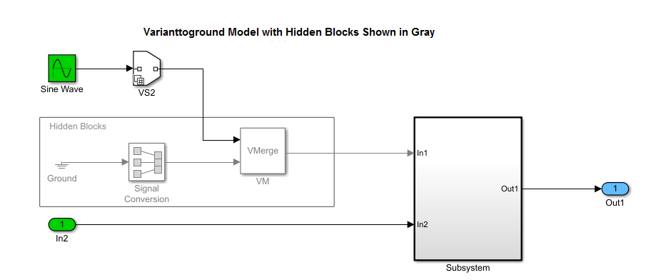 Например, модель Varianttoground содержит блок источника варианта с одним вариантом. При управлении вариантами SYSCONST_A==6 имеет значение true, вход в Subsystem - синусоидальная волна. Когда SYSCONST_A==6 имеет значение false, вход в Subsystem является 0.0.