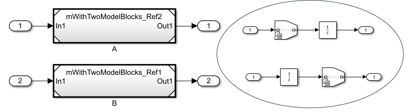 Рассмотрим эту модель с двумя блоками Привязки модели (Model References), которые являются условными из-за встроенных вариантов.