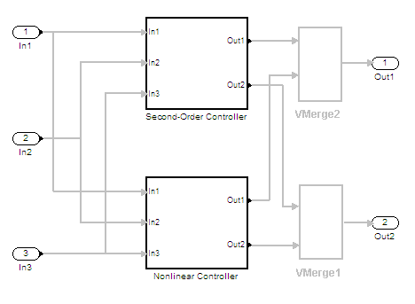 При сравнении с общим блоком объединения VariantMerge блок может иметь только один параметр, который является числом входов. VariantMerge блок используется для генерации кода в вариационных подсистемах внутри и не доступен снаружи для использования в моделях. Количество входов для VariantMerge определяется и подключается, как показано на рисунке ниже.