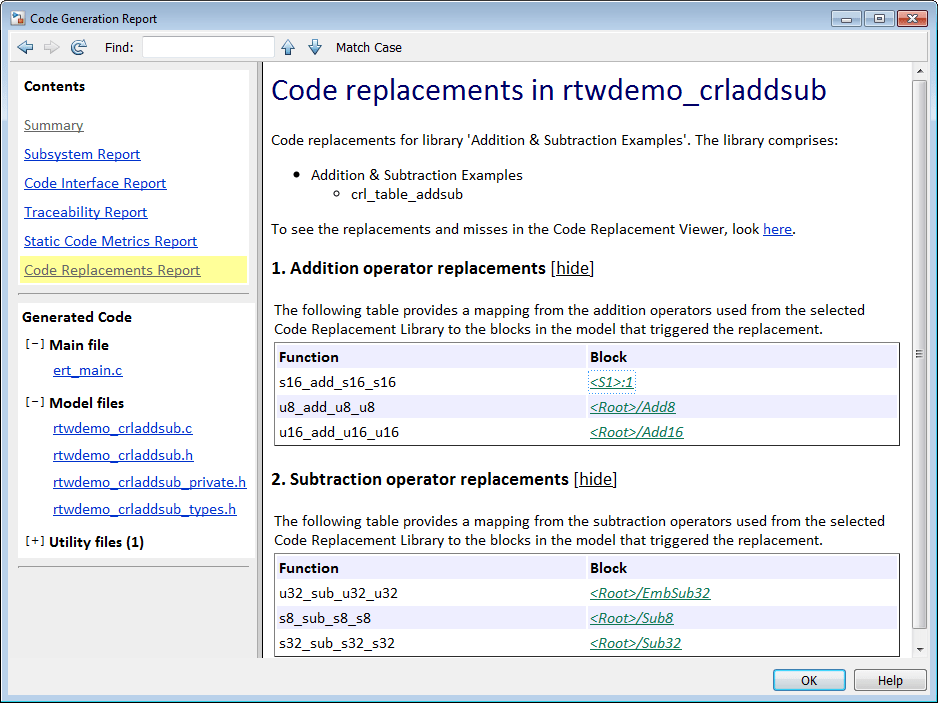 На рисунке ниже показан отчет о замене кода, созданный для модели CRL. rtwdemo_crladdsub. Каждая используемая функция замены отображается в списке со ссылкой на блок, инициировавший замену.