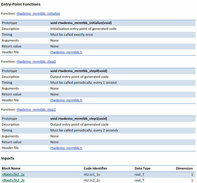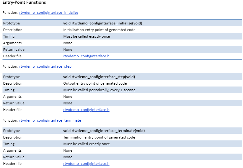 Например, вот подраздел «Функции точек входа» для модели. rtwdemo_configinterface.