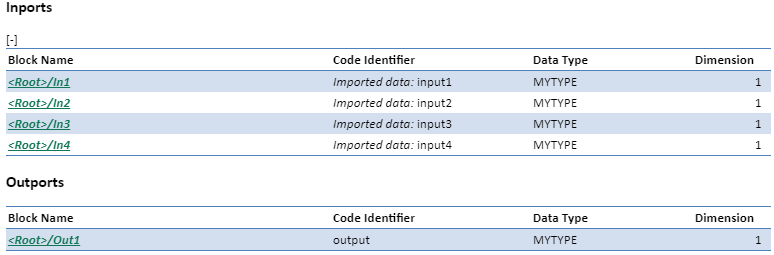 Для большого подраздела в докладе приводится [-] и [+] символы, позволяющие свернуть или развернуть этот раздел. В примере, приведенном в предыдущем разделе, символы представлены для разделов Inports и Interface Parameters.
