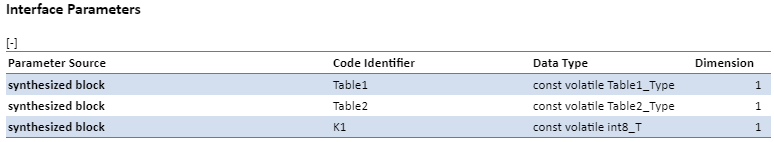 Подраздел Interface Parameters отчета о кодовом интерфейсе содержит следующую информацию о настраиваемых параметрах, связанных с моделью.