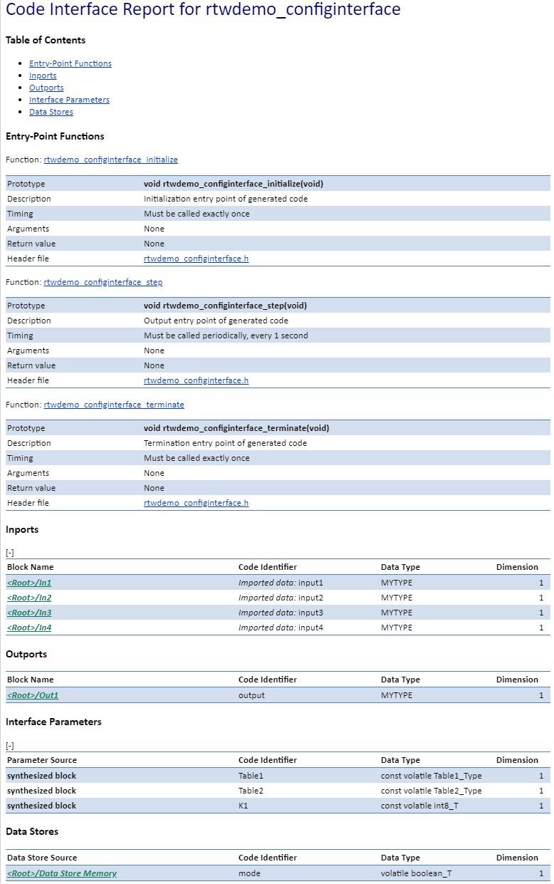 rtwdemo_configinterface (с помощью кнопки «Класс глобального хранилища», выбранной в окне модели) для примеров подразделов отчета