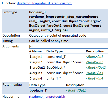 rtwdemo_fcnprotoctrl для примеров аргумента функции и информации о возвращаемом значении