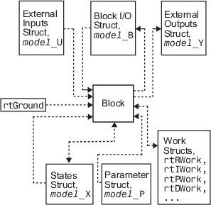 }Блоки имеют входы, выходы, параметры, состояния, а также другие общие свойства. Например, входы и выходы блоков обычно записываются в структуру блочного ввода-вывода (генерируемую идентификаторами типа , где model_B - имя модели). Входы блоков также могут поступать из внешней структуры ввода (modelили структура состояния при подключении к порту состояния интегратора (model_U) или заземление (model_XrtGround) если не подключен или заземлен. Блочные выходы также могут поступать во внешнюю структуру вывода, (). На следующей схеме показаны общие сопоставления блочных данных.model_Y