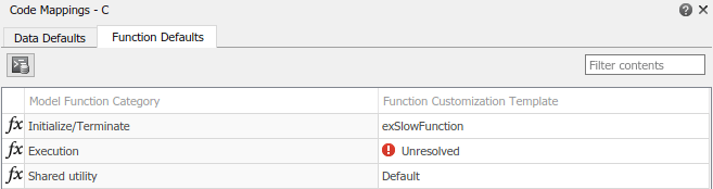 Если пользователь удаляет определение класса хранения, шаблона настройки функции или раздела памяти из словаря встроенного кодера, связанного с моделью, редактор сопоставлений кодов определяет определение как Unresolved. Например, на этом рисунке показано, что шаблон настройки функции для функций начальной точки выполнения был удален из словаря, связанного с моделью.