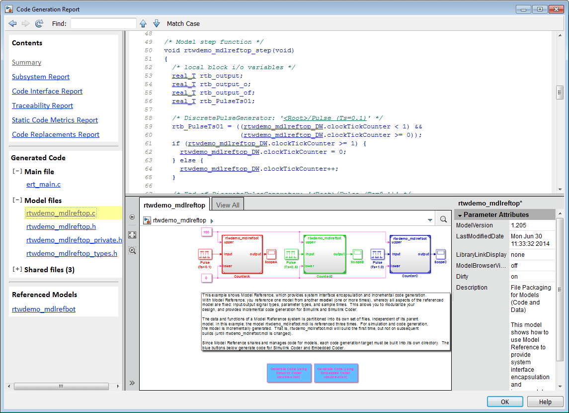 Для просмотра и анализа созданного кода рекомендуется переходить между кодом и моделью. В отчет о создании кода HTML можно включить веб-представление модели. Затем модель и созданный код можно совместно использовать вне среды MATLAB. При создании отчета веб-представление включает атрибуты блок-схемы, отображаемые в редакторе Simulink Editor, например, порядок выполнения сортировки блоков, свойства сигнала и типы данных порта.