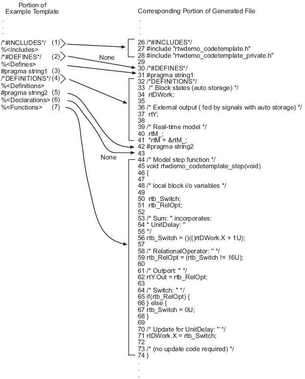 | (7) | %<Functions> | 44–74 | Функции | Наконец, генератор кода добавляет функции из модели, а также комментарии, заданные в диалоговом окне Параметры конфигурации (Configuration Parameters). Но он не добавляет комментарии в качестве заголовка для функций, потому что шаблон не имеет таковой. Этот код является последним, поскольку запись шаблона является последней. |