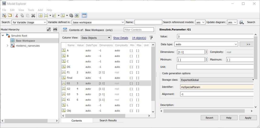 В отчете о создании кода подтвердите идентификатор объекта параметра. G1. Созданный файл rtwdemo_namerules.h представляет G1 с переменной mySpecialParam.