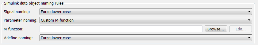 DefineМожно указать правило именования, которое применяется только к объектам данных Simulink, для класса хранения которых задано значение Define. Для этих объектов данных указанное правило именования переопределяет другие правила именования параметров и сигнальных объектов. На панели «Создание кода» > «Идентификаторы» диалогового окна «Параметры конфигурации» настройте параметр именования # define.