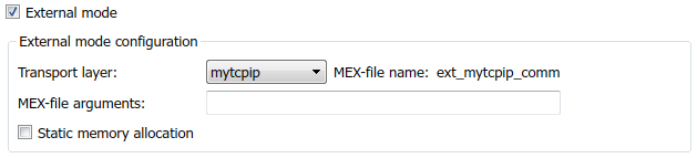 - имя связанного с транспортом внешнего интерфейса MEX-файла (например, mexfile'ext_mytcpip_comm')