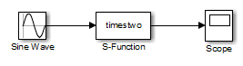 Дважды щелкните блок S-Function, чтобы открыть диалоговое окно «Параметры блока». Введите имя S-функции timestwo. Нажмите кнопку ОК. Теперь блок привязан к timestwo MEX-файл.