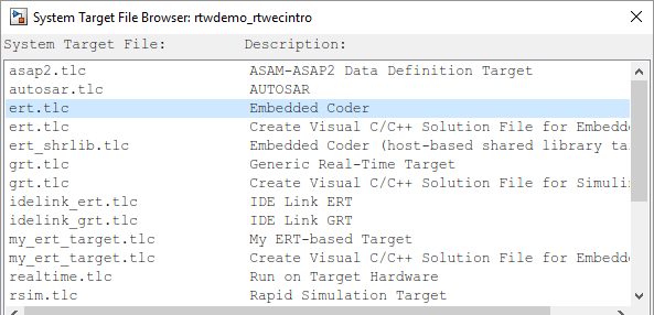 В браузере файлов прокрутите список целевых объектов, чтобы найти новый целевой объект. my_ert_target.tlc. (На этом шаге предполагается, что путь MATLAB содержит c:/work/my_ert_target/my_ert_target, как было установлено ранее в разделе Создание целевых папок.)