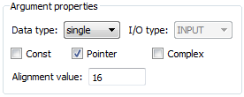 -1 (по умолчанию) - если данные являются Simulink.Bus, Simulink.Signal, или Simulink.Parameter указывает, что генератор кода определяет оптимальное выравнивание на основе использования. В противном случае указывает, что для этого аргумента не требуется выравнивание.