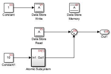 Simulink предполагает, что Atomic Subsystem может обновить хранилище данных, поэтому Simulink буферизирует хранилище данных. Atomic Subsystem выполняется после того, как Data Store Read буферизирует свои выходные данные, и буфер обеспечивает способ использования блоком Sum значения хранилища данных, как это было при выполнении Data Store Read.