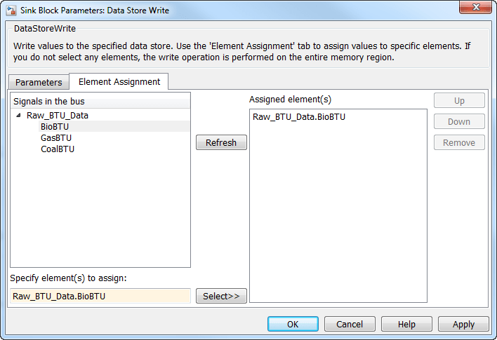 На вкладке «Назначение элемента» в разделе «Сигналы на шине» разверните содержимое хранилища данных. Raw_BTU_Data. Щелкните элемент BioBTUи нажмите кнопку «» Выбрать «». Нажмите кнопку «» ОК «».