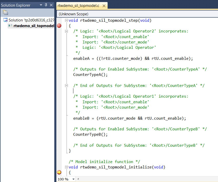 При запуске моделирования SIL, например, на компьютере с ОС Windows, или model.c открывается в Microsoft Visual Studio IDE с точками останова отладчика в начале model.cppmodel_initialize и model_step функции.