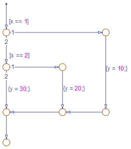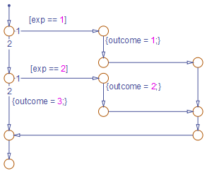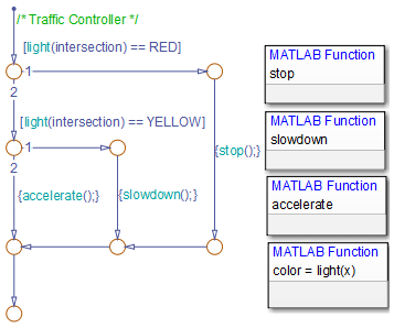 Функции MATLAB на диаграмме содержат код, указанный в таблице. В каждом случае функция Inline Option имеет значение Auto. Дополнительные сведения о встраивании функций см. в разделе Задание свойств графических функций (поток состояний).