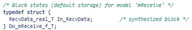4. Для просмотра типа данных полученных сообщений, если тип данных является совместно используемым (например, встроенные типы данных, импортированные типы шины или экспортированные типы шины с указанным типом данных), информация размещается в файле общего заголовка. Если тип данных не может использоваться совместно, информация находится в файле заголовка модели ,mReceive.h. Для этого примера просмотрите тип данных с общим доступом, открыв файл с общим заголовком. RecvData_real_T.h.