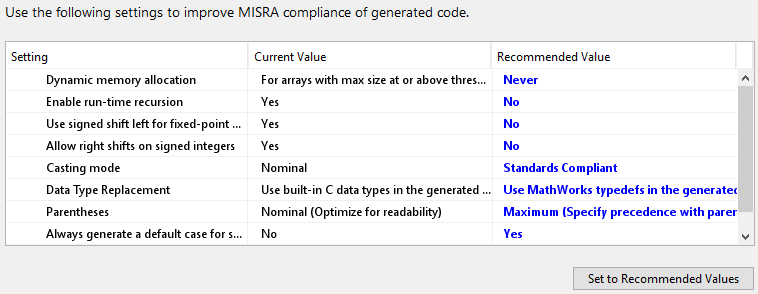 Ассоциация по надежности программного обеспечения автомобильной промышленности (MISRA ®) [1] разработала «Руководство по использованию языка C в критических системах» (MISRA C ®). При создании кода из кода MATLAB ®, если имеется Embedded Coder ®, можно настроить определенные параметры генерации кода для увеличения вероятности генерации кода C и C++, соответствующих рекомендациям MISRA C:2012 и MISRA C++: 2008.